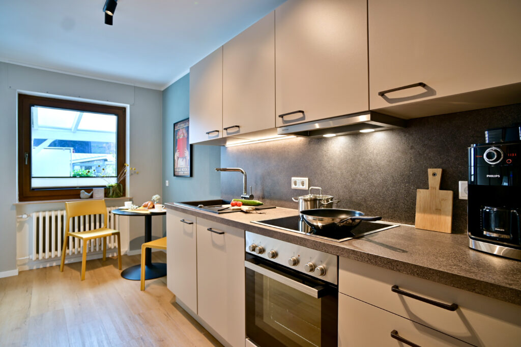 Eine neue moderne Küche, komfortabel ausgestattet mit 4-Zonen Cerankochfeld, Backofen, Spülmaschine, Kühlschrank mit Gefrierfach, Kaffeemaschine, Wasserkocher, Eierkocher, Toaster usw.