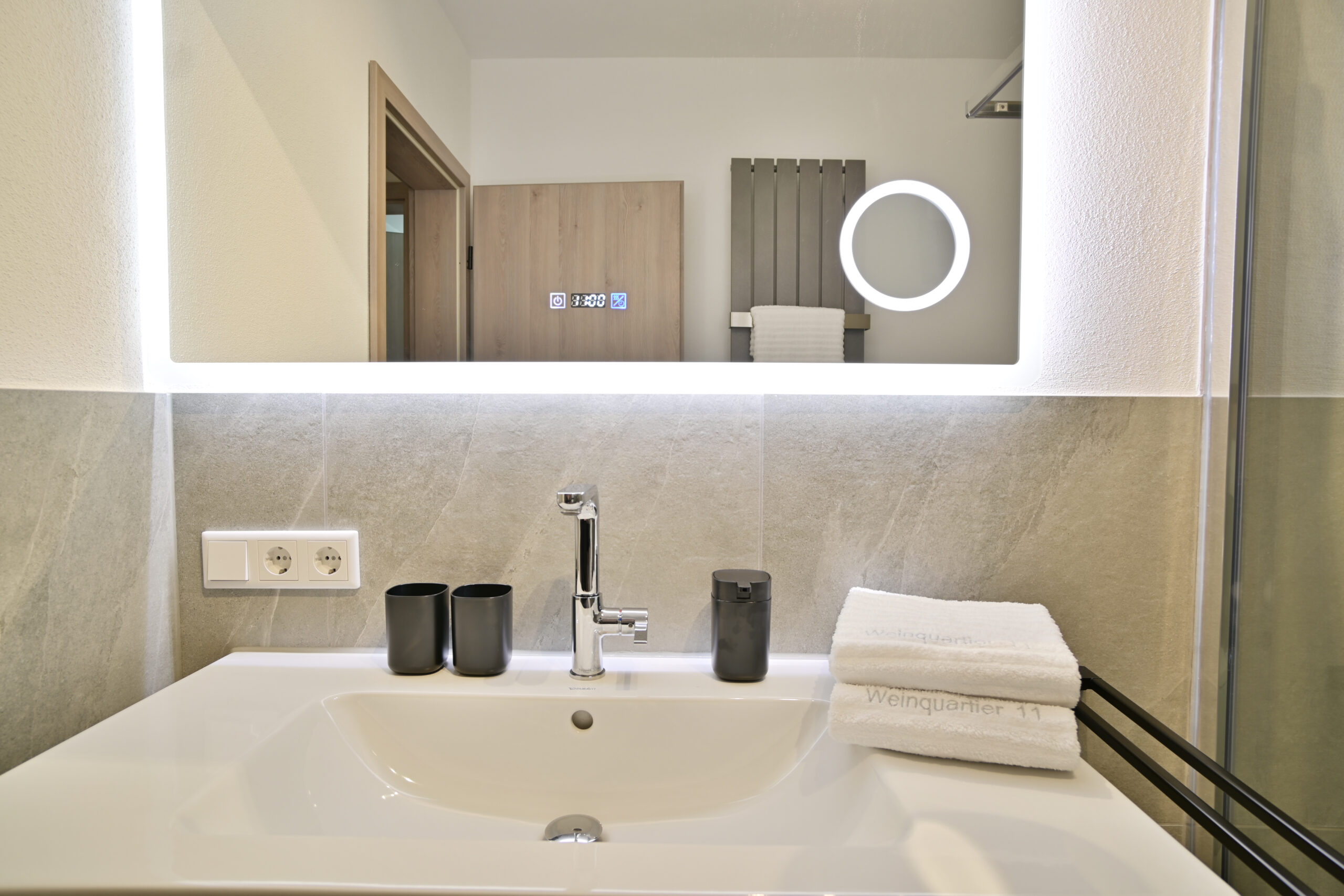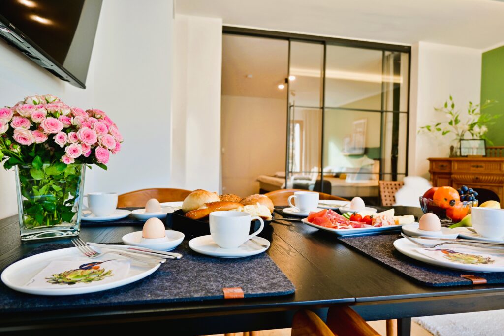 Wohn-/Esszimmer mit Flachbildfernseher und private, möblierte Terrasse mit Burgblick. Von der Terrasse gelangt man auf die für alle Gäste zugängliche überdachte Terrasse der Weinlounge.