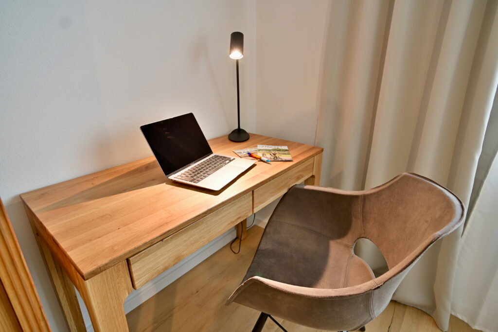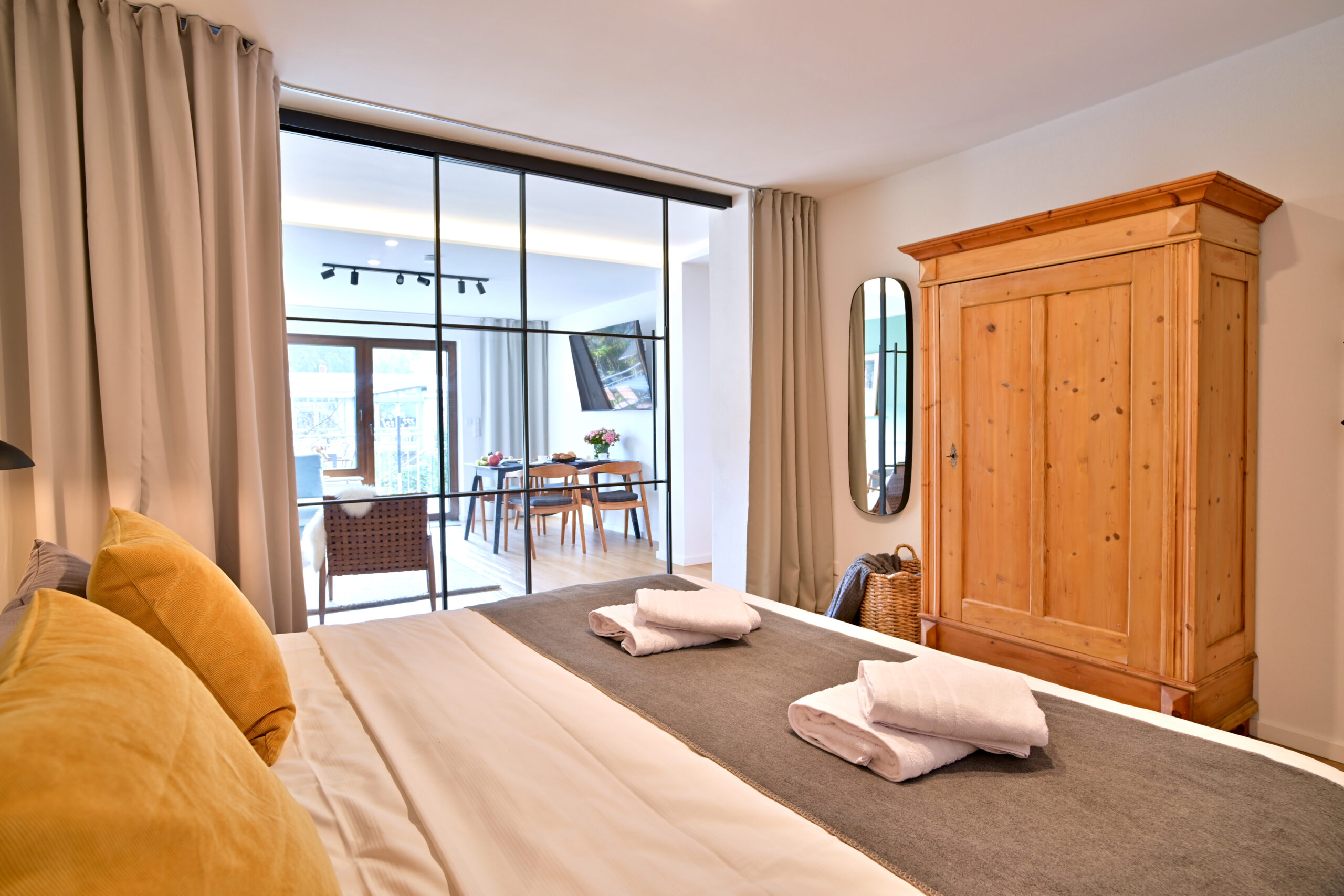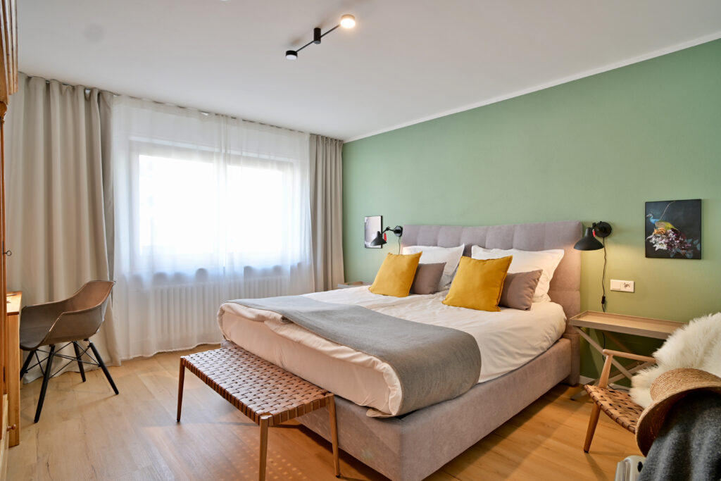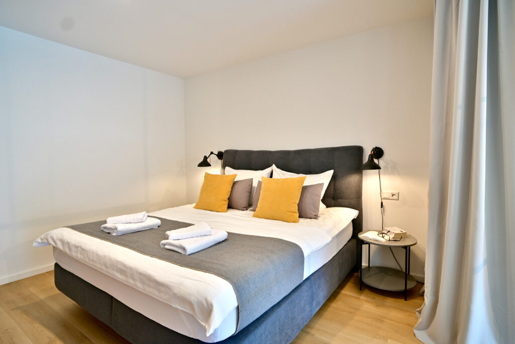 Eines der Schlafzimmer mündet mit einem stylischen Loftfenster an dem sich Verdunklungsvorhänge befinden ins Wohnzimmer, so dass es hell, modern und lichtdurchflutet ist.