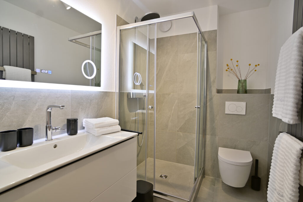 Zwischen den beiden Schlafzimmern befindet sich vom Flur aus zugänglich die Dusche und WC.