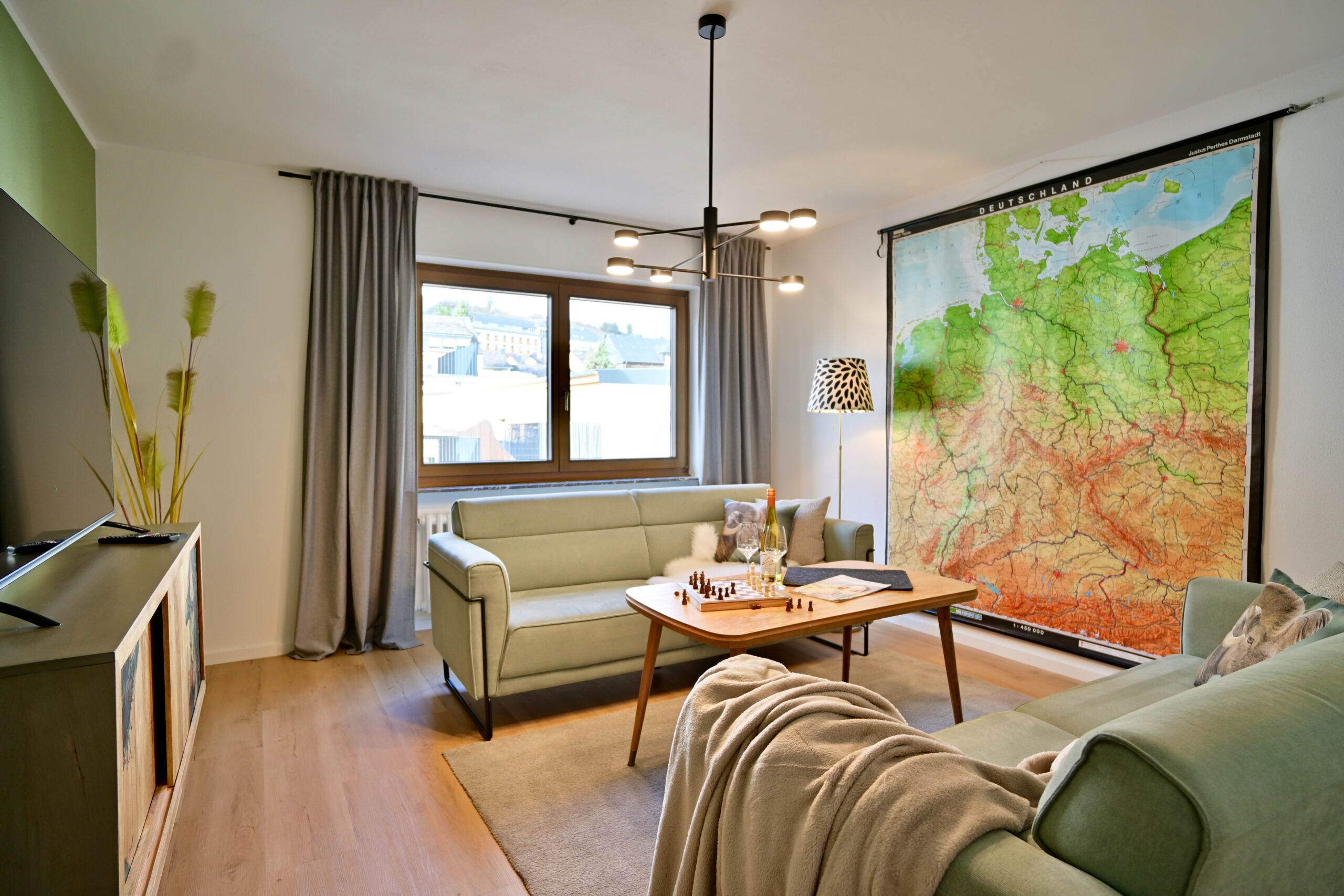 Das Wohnzimmer ist liebevoll eingerichtet und verfügt über 2 Couches und Flachbild TV.