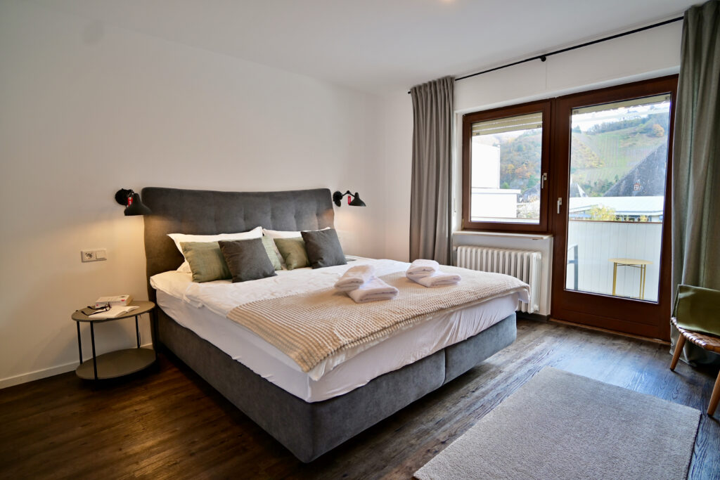 Der überdachte, möblierte Balkon mit Burgblick ist von beiden Schlafzimmern aus zugänglich und bietet einen traumhaften Blick zur Burg Landshut, dem Wahrzeichen der Stadt Bernkastel-Kues.